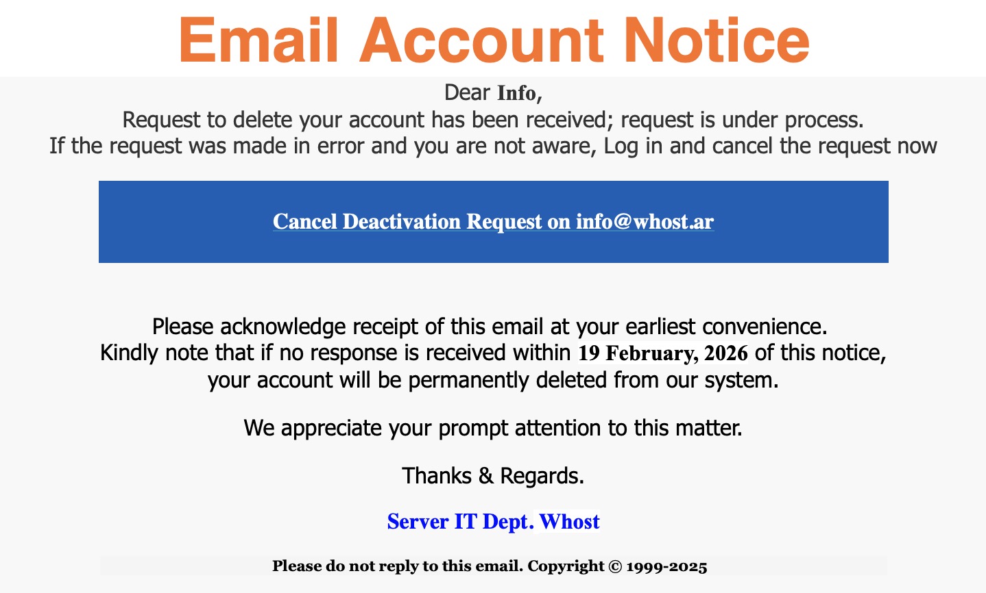Hoy ha comenzado a circular un nuevo spoofing email. Se adjunta copia. Nunca ingresen en los enlaces. El sistema no envía este tipo de correos.