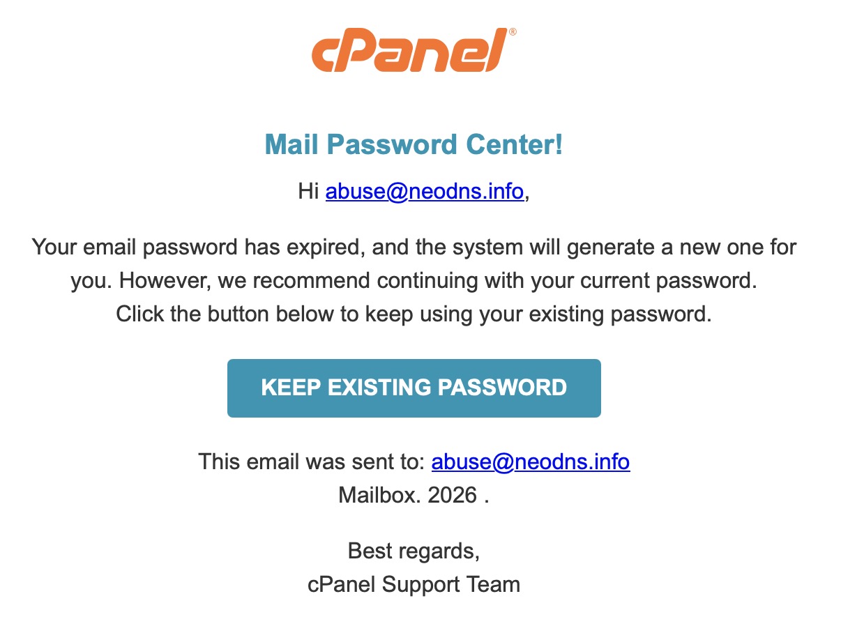 Hoy comenzó a circular un nuevo spoofing email. cPanel nunca le enviará este tipo de correos. Si lo recibe no ingrese al enlace, es un spoofing email para robar sus datos de acceso.