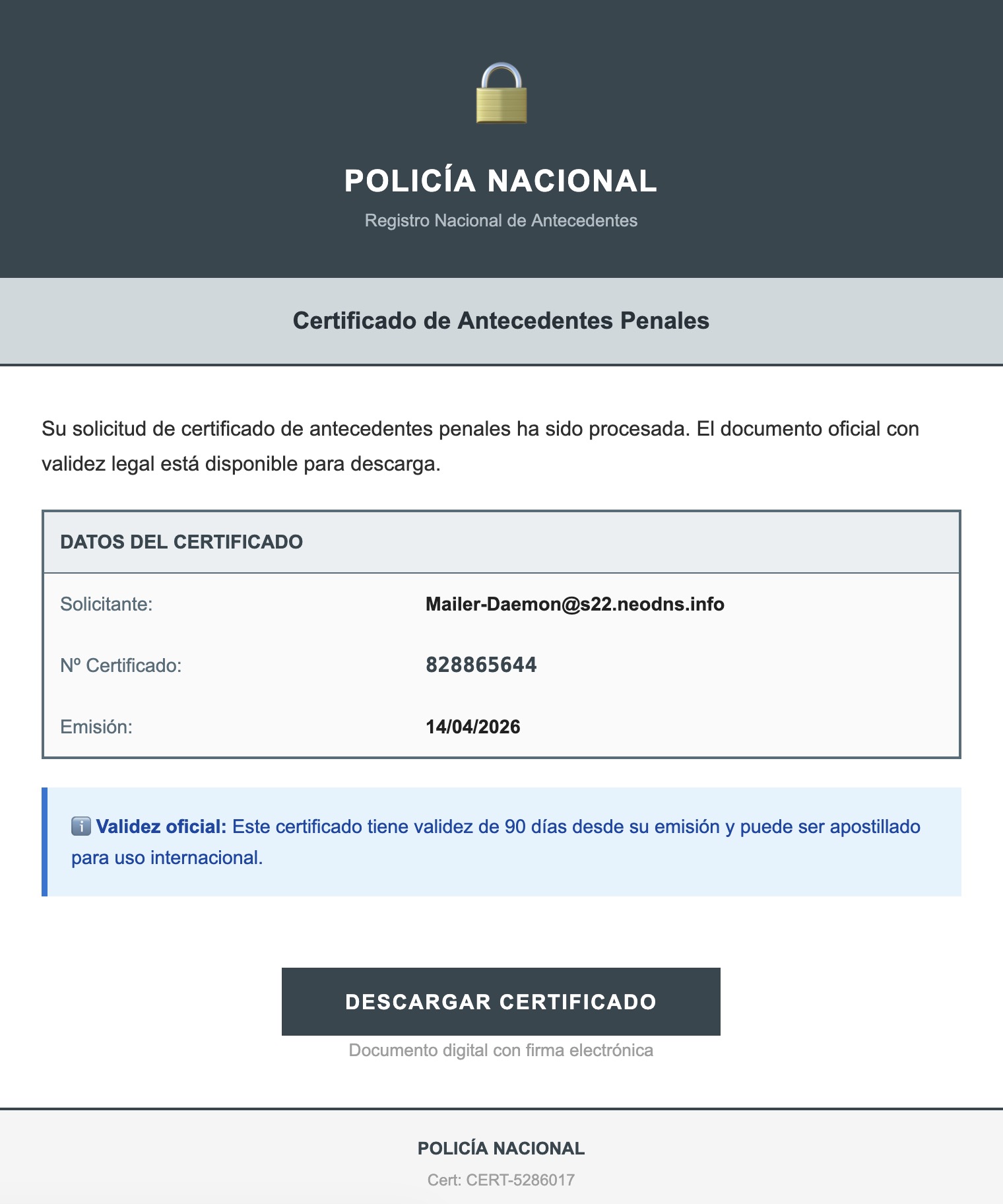 Hoy comenzó a circular un nuevo spoofing email. Si recibe este correo no abra el enlace, es un virus. La policía no envía correos.